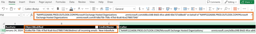 In reviewing the results, it is evident that on January 24, 2024, the actor created an inbox rule entitled ‘Redirect all incoming emails‘. Recall, the inbox rule was created via Outlook on the Web and now we see it recorded in the form of the cmdlet called ‘New-InboxRule‘.