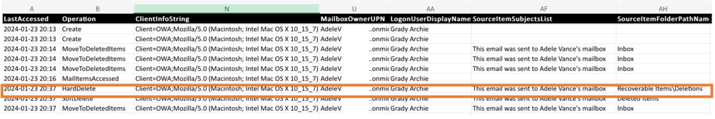- Operation – specifies the type of activity performed. A ‘HardDelete’ operation indicates that an email was deleted. Note, there are three phases of deletion when an email is deleted, but that is a topic for another day.