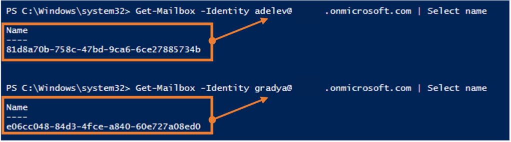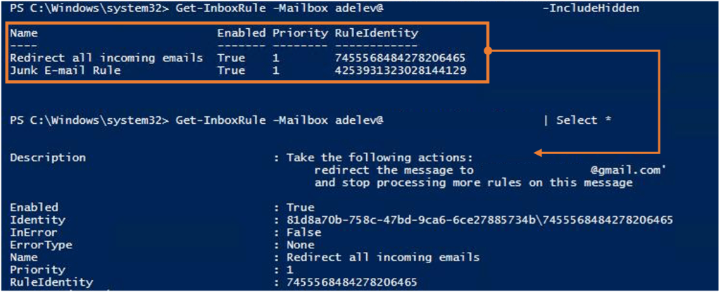 What’s interesting is that the ‘Caller‘ does not explicitly state who created the mailbox rule. However, it does suggest that this was done by a delegate as per the ‘on behalf of’. The randomized characters observed are unique identifiers that are often associated with a user object. To differentiate between the two and ascertain who is who, we can use the ‘Get-Mailbox’ cmdlet as per below to obtain the identifier for each user.