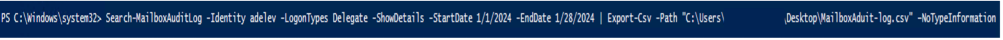 To determine what specific actions were taken on the mailbox such as whether or not the actor may have accessed or deleted an email on the delegated mailbox, we can consult the Mailbox Audit Log. This can be queried for the user of interest using the cmdlet ‘Search-MailboxAuditLog‘ and then subsequently specify that we are only interested in actions performed by a delegate by setting the ‘LogonTypes‘ parameter to ‘Delegate‘.